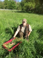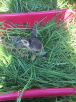 Das gerettete Kitz bezieht ein Zwischenlager, zum Beispiel einen Wäschekorb. So wird es vorübergehend am Rande der Wiese/Wald im Schatten „geparkt“ und nach der Mahd an seinen Ursprungsplatz zurückgebracht, damit es von der Mutter wiedergefunden wird. Wichtig ist, dass bei der Rettungsaktion möglichst kein menschlicher Geruch auf das Kitz übertragen wird. Daher ist der Einsatz von Handschuhen ganz wichtig.
