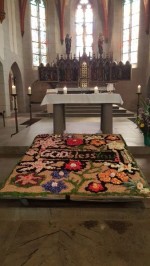 „God bless you" („Gott segne dich") – dieser Segensspruch war in mühevoller Arbeit in allen Farben des Regenbogens als Blumenteppich vor dem Altar der Pfarrkirche St. Peter in Ketten gestaltet. Damit griffen die kleinen und großen Pfadfinderinnen und Pfadfinder eine deutschlandweite Aktion auf, diesen Segensspruch in vielen bunten Farben an Kirchen, an Kindergärten, an Pfarrheimen anzubringen. „Es ist der Aufruf aller Jugendverbände und Jugendeinrichtungen des Bistum Limburgs und ganz Deutschlands zu zeigen: Gott ist wunderbar groß! Und er hat ein weites weites Herz", ist sich die Pfadfinder-Kuratin und Pastoralreferentin Inge Rocco sicher. Und bezeichnete den Regenbogenfarben-Segen als „politische Aktion" anstelle der sonst obligatorischen Prozession. Beides habe die Absicht, der Öffentlichkeit zu zeigen: Gott begleite die Menschen und sage ihnen durch Jesus Christus zu: „Ich bin mit euch alle Tage, bis zum Ende der Welt!"