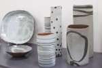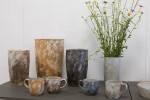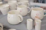 Meyer und Matschke gestalten in Majolika-Technik gemeinsam ganz bezaubernde Tiermotive auf Gebrauchskeramik. Auf dem Tisch daneben leuchtet türkisfarbene Raiku-Glasur mit ihren typischen Krakeleen. Dunklen Ton mit Glasurflecken findet man von Maryam Aghaalikhani, dagegen gestaltet Claudia Henkel zarte spitzenbesetzte Porzellantäschchen für Blumen. Ganz im Kontrast zum zarten Porzellan stehen Armin Skirdes rustikale Humpen und Steinzeug.