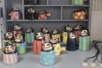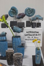 Witzige Streuer-Monster und Räuchermännchen im Käfig präsentiert Stefanie Schmoltzi. Vasen und Tassen sind die Spezialität von Martin Goerg. Tanja und Gideon Necker stellen humorvoll konzipierte Gartenfiguren und Salzstreuer aus. Fast stolpert man über einen imposanten Tapir von Andreas Hinder. Dunkelbraun, eine selten genutzte Farbgebung wählt Arthur Müller für seine Gefäße. Auf einem langen Tisch mit Designer-Deckelgefäßen findet man unter anderen einen ockerfarbenen Topf mit grauem Dekor und Eichendeckel neben einem fein gearbeiteten Katzendöschen und einem kubistischen Objekt.