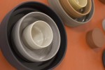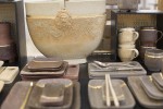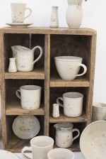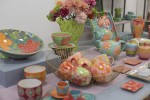 Katrin Bachmann setzt zarte Akzente auf weißen Grund, während Monika Debus die Kombination Grau mit Türkis liebt. Braun-beige-blau dominiert die Farbgebung auf Arwed Angerers Gefäßen und mit Goldbordüren sind die braun-beigen Objekte der Kaffiné-Keramik verziert.