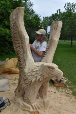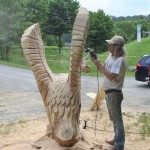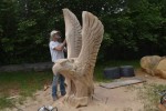 Jens Röser: „Als ich mit dem Zuschnitt des Adlers begann, lag ein rund 2,50 mal 1,50 Meter großer, zentnerschwerer Eichenstamm auf der Wiese. In meinem Kopf begann ich mit der Planung, wie ich vorgehen wollte, und welche Gestalt der Adler annehmen sollte. Für die Fertigstellung eines solchen Objektes kann man keine Planzeichnung gebrauchen, weil sich immer wieder die Form ändern kann. Ich habe praktisch eine Art Grundriss im Kopf. Das Schwierigste bei der Arbeit an dem Adler war das Herausschneiden des Riesenstückes Eiche zwischen den Flügeln. Als ich endlich das Zwischenstück herausgeschnitten hatte, lag ein Brocken von rund 80 Kilogramm zu meinen Füßen. Außerdem hat bei diesem Zuschnitt meine Kettensäge den Geist aufgegeben.“