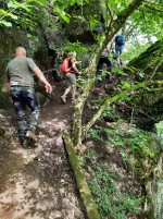 Stein-Wingert. "Hinaus in die Natur und neue Wege entdecken" lautete das Motto einer geführten Wanderung, die in der Facebook-Gruppe "Wandern im Westerwald" der Kuriere angeboten wurde. 15 Wanderbegeisterte machten sich vom Wanderparkplatz in Stein-Wingert auf, um auf Schusters Rappen das Ende der Welt zu erkunden. Wer jetzt behauptet, dass das Ende der Welt mit Feuer und großem Krachen eingeleitet wird, der kennt den Naturpfad „Weltende“ im Herzen der Kroppacher Schweiz noch nicht. Denn wer auf ein wenig Abenteuer aus ist, für den ist dieser Wanderweg, der Teil des Westerwaldsteiges ist und inmitten der Kroppacher Schweiz liegt, ein absolutes Muss. Dafür bietet die Wandertour einen unvergesslichen Mix aus Wandern auf schmalen Pfaden und teilweise alpinen Strecken sowie den Einblick in einen alten Bergwerksstollen. Namensgeber des Wanderpfades sind übrigens die Ortsteile Alhausen der Gemeinde Stein-Wingert (WW-Kreis) und Flögert von Helmeroth (AK-Kreis). Denn in beide Orte führt nur eine Straße hinein. Wer wieder hinaus möchte, muss sein Fahrzeug mitten im Dorf wenden und ist quasi am Ende der Welt angekommen. Der Aussichtspunkt „Weltende“, höchster Punkt der Wanderstrecke, ermöglicht einen eindrucksvollen Blick ins Tal der Nister und wurde von den Wanderern zur verdienten Rast genutzt.