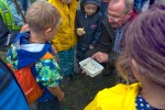 Ausgiebig erkundeten die Kinder und die Erwachsenen das Seeufer und das Gebiet rund um den See. In den mitgebrachten Becherlupen versuchten die Kinder Tiere aufzuspüren, zu fangen und zu betrachten. Die gefangenen Tiere wurden dann in eine Schale geschüttet und konnten ausgiebig bewundert werden. Wasserflöhe, sogar zwei gefährlich aussehende Wasserskorpione, ein toter Gelbrandkäfer und jede Menge Kaulquappen konnten die Kinder fangen. Leider waren die Fische zu schnell und auch mit Hilfe der Papas konnte kein Fisch gefangen werden. Alle Tiere wurden anschließend wieder freigelassen, bevor es dann auf den Weg ging um Fossilien zu suchen.