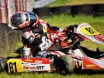 Im zweiten Rennen erlebte er dann jedoch einen herben Rückschlag. Bereits in der Formationsrunde hatte er einen heftigen Einschlag in die Boxenmauer. Sein Gaszug war defekt, was bedeutet, dass sein Kart einfach Vollgas gegeben hat. Dadurch konnte er nichts mehr tun und krachte mit etwa 70 km/h ungebremst in die Mauer und den Reifenstapel. Erfreulicherweise konnte er selbständig aus dem Kart aussteigen und anschließende Untersuchungen ergaben, dass er lediglich mit ein paar Prellungen und einer Zerrung der Muskeln im Hals-/ Schulterbereich davongekommen ist.