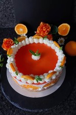Hole jetzt den Boden aus dem Kühlschrank, stelle an den Rand ein paar dünne Scheiben Orangen, fülle die Creme darauf und verteile sie gleichmäßig. Stelle sie nun wieder in den Kühlschrank.