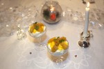Die dritte Apfelsine schälen und filetieren. Zwei Esslöffel Zucker in einer Pfanne karamellisieren. Rest Saftmischung zugeben und Apfelsinenfilets darin wenden, kurz köcheln. Kandierte Apfelsinenfilets auf den Desserts verteilen. Mit Zitronenmelisse garnieren.