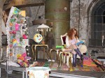 Schon am Motto konnte man erahnen, dass etwas Außergewöhnliches stattfinden würde. Alleine Tina Hüschs Outfit und die Bühnendeko verrieten, dass nicht eine stocksteife Lesung in Verbindung mit dem Rezitieren von Gedichten geboten würde. Ihre bunte Kleidung passte absolut zu der Bühnendeko, die eher wie ein Puppenhaus in einem Kinderzimmer eingerichtet war.