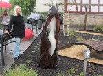 Montabaur. Leider zeigte der Wettergott bei der offiziellen Übergabe und Einweihung der Skulptur “Erneuerung“ in Montabaur kein Mitleid und sandte ohne Unterbrechung feuchte Grüße aus den Wolken. Da zudem noch ein kräftiger Wind blies, war es nicht verwunderlich, dass sich nur wenige Gäste zum Caroline-Kahn-Platz wagten. Karin Maas, die Leiterin der Tourist- Information Montabaur, begrüßte die Gäste, darunter auch Stadtbürgermeisterin Gabi Wieland, und freute sich sehr darüber, dass die Künstlerin und Bildhauerin Simone Carole Levy, die die Skulptur erschaffen hat, persönlich vor Ort war, um der Übergabe beizuwohnen.