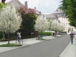 Keine leichte Aufgabe für das Planer-Team rund um Hiltrud Duquesnoy von TDB Landschaftsarchitekten: “Die Natursteinbrüche in der näheren und weiteren Umgebung von Montabaur sind wegen der hohen Auslastung nicht in der Lage, ausreichende Mengen des benötigten Materials fristgerecht zu liefern. Häufig verarbeiten sie ihren grünlichen Stein zu Splitt.“ Zusammen mit dem Natursteine-Importeur Eurostone aus Rheda-Wiedenbrück wurde Duquesnoy schließlich in einem rumänischen Steinbruch fündig: Der grünliche Andesit hat eine hohe Qualität, wird aber lokal wenig nachgefragt und steht deshalb in großer Menge zur Verfügung. Einen Produktnamen hatte der Stein bislang nicht, daher taufte das Planer-Team ihn spontan “Monte Verde“ in Anlehnung an den Schlossberg, dem er künftig zu Füßen liegen wird.