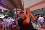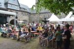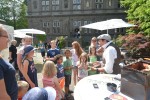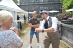 Apropos Meter: Weit mehr als einen Meter hoch war ein Seil gespannt, auf dem im Innenhof die ausgebildete Zirkuskünstlerin Marianne Engels, die aus der Ecke von Budapest kommt, „tanzte“ und Jung und Alt in ihren Bann zog. Unterwegs war auch immer „Clohn Rudi“, der mit seinen Tricks die Besucherinnen und Besucher an den Tischen verblüffte und munter drauf los plauderte. Wem nach etwas Ruhe genehm war, der konnte im Rosengarten flanieren, vielleicht mit einem leckeren Cocktail in der Hand. Oder aber sich ein eigenes Bild von dem Ambiente im renovierten Rittergebäude und den eingedeckten Sälen machen.