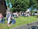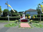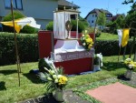 Der Altar am „Herzplatz“ (Spielplatz in Schellenberg) war von der dortigen Nachbarschaft in Zusammenarbeit mit unserem Ortsausschuss und weiteren Helfern und Helferinnen aufgestellt und wunderbar geschmückt worden. Das alte, wertvolle Altartuch lud mit der Aufschrift „Kommt, lasset uns anbeten“ dazu ein, Jesus in der Gestalt des Brotes zu verehren. Besondere Beachtung fand der Blumenteppich, der mit den Symbolen Kreuz, Hostie und Kelch auf unseren Glauben und den Sinn des Fronleichnamsfestes hinwies.