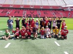 Zusätzlich in das Wochenprogramm aufgenommen war ein Besuch in der BayArena in Leverkusen. Der Kreisvorsitzende Marco Schütz hatte das mit Sportlehrer Peter Litzinger, der einst selbst in den Diensten von Bayer Leverkusen stand, in die Wege geleitet. Leverkusen-Jugendscout Dirk Dickmann betätigte sich als Guide und berichtete von der Jugendarbeit bei Bayer 04. Dann ging es gruppenweise in die BayArena, für viele der Kids der erste Stadionbesuch überhaupt. Jung-Nationalspieler Florian Wirtz stand für Foto-Aufnahmen gerne zur Verfügung. Im Clubheim gab es ein herzhaftes Mittagessen. Mit interessanten Eindrücken von einem Bundesliga-Club und auch seiner Jugendarbeit kehrten die Teilnehmer in das Ferien-Camp zurück.