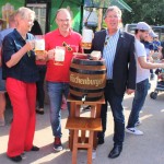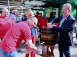 Dort hatten sich viele Zuschauer eingefunden. Es hatte sich wohl herumgesprochen, dass Gabi Wieland ein Fass Freibier anschlagen wird. Mit nur drei Schlägen gelang es der Stadtbürgermeisterin, den Zapfhahn in das Fass zu treiben, kaum etwas von dem kostbaren Nass spritze durch die Gegend. Bei dieser Gelegenheit entstand schon eine Volksfeststimmung, zumal der Musikverein Heiligenroth den Stimmungspegel mit flotter Musik antrieb.