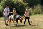 Als nächste Attraktion kam dann die Feuerwehr auf den Platz. Nachdem das Fahrzeug und ein Atemschutzanzug ausführlich erklärt und bestaunt worden waren, wurde für eine kurze Abkühlung gesorgt, die von allen sehr genossen wurde. Damit war das Programm aber noch nicht zu Ende. Unterstützt von Janine Reuscher von der Reitanlage Reuscher und ihrem Sommerferienprogramm, was kurzerhand zu Besuch auf das Pfadfinderlager kam, konnten die Kinder auf zwei Ponys reiten.