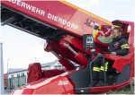 An der ersten Station musste abgeschätzt werden, wie weit die Drehleiter in der Waagerechten mit drei, zwei oder einer Person im Korb ausgefahren werden kann. Die Punkte mussten mit Pylonen gekennzeichnet und die Leiter dann punktgenau ausgefahren werden.