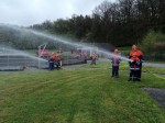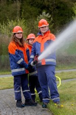 Den weiteren Vormittag gestaltete man mit gemeinsamen Spielen bis zum Einlauf der nächsten Einsatzmeldung: "Feuer auf dem Gelände der Kläranlage Mogendorf". Hier hatten Thomas Huberty und Kevin Vogel einen Gebäudebrand mit Holzpaletten simuliert. Schnell wurden Schläuche ausgerollt und das Feuer mit 2 C-Rohren bekämpft. Danach hatten sich alle das Mittagessen reichlich verdient. Während sich die Jugendlichen mit Sport und Spielen auf den nahenden Feierabend vorbereiteten, wurden sie zu einem letzten Einsatz in das Gewerbegebiet Reimersheck gerufen. Unter Anleitung von Thomas Huberty durften alle Jugendlichen einen Flüssigkeitsbrand mit einem Pulverlöscher bekämpfen.
