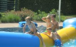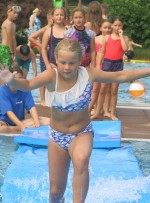 Zum Ende hin forderte die gespannte Laufmatte auf dem Wasser den Ehrgeiz vieler Kinder und machte auch vor den Erwachsenen nicht halt. Hier ging es darum, sich möglichst lange auf der wackeligen Matte zu halten, ohne ins Wasser zu fallen.