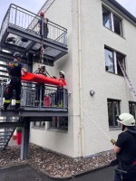 Direkt nebenan wurde durch die Kameraden der Absturzsicherung das Halten- und Rückhalten sowie die Rettung einer Person über tragbare Leitern geschult. Den Teilnehmern wurden die wichtigsten Knoten und Vorgehensweisen mit ihrem Haltegurt gezeigt und im Anschluss praktisch angewandt. Zum Abschluss wurde das Material der Absturzsicherung besprochen und die Rettung einer Person mit dem Material der Absturzsicherung demonstriert.