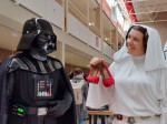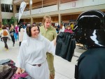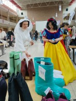 Für besonderes großes Aufsehen sorgte dann sicherlich die Idee, die Charaktere des Films den Flohmarkt besuchen zu lassen. Darth Vader, begleitet von Prinzessin Leia und Luke Skywalker, betraten die Aula der Ernst-Barlach-Realschule plus und sorgten somit für erstaunte Gesichter bei den anderen Flohmarktbesuchern. Die Star Wars Figuren schlenderten zwischen den Tischen umher und schienen genauso interessiert an den ausgefallenen Accessoires und Second-Hand Kleidungsstücken wie die anderen Besucher zu sein. Einige Kinder nutzten die Gelegenheit, um Fotos mit den berühmten Star Wars Figuren zu machen und sich mit ihnen zu unterhalten. Später besuchte auch noch Schneewittchen im bunten Kostüm den Flohmarkt und sorgte für leuchtende Augen.
