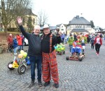 Udo Fuchs, seines Zeichens Vorsitzender vom KKM, war die Freude über das trockene Wetter buchstäblich anzusehen, als er auf dem Dorfplatz den Startschuss zum Bollerwagenumzug gab. Lautstark zählte die Menge, bestehend aus aktiven Teilnehmern und vielen Zuschauern, von zehn runter auf null und schon ging es los. Scherzhaft meinte Udo bei einem Gespräch mit dem WW-Kurier, angesprochen auf die verschärften Auflagen durch das Polizeiordnungsgesetz (POG) und die Auflage, die Zugwägen dem TÜV vorzuführen: "Bei der Ordnungswut und Bürokratie in Deutschland hätte es mich nicht gewundert. Alles ist möglich und manchmal glaubt man es kaum. Wir lassen uns den Spaß am Feiern durch nichts verbieten."