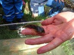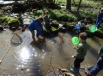 Die Exkursion endete mit einer praktischen Übung: Die Kinder der Gruppe, ausgestattet mit Keschern und Becherlupen, konnten im Wasser verschiedene Tierarten beobachten und identifizieren. Dabei erfuhren sie auch, wie wichtig der Schutz von Wäldern für die Fließgewässer ist. Sie bieten eine Vielfalt an Lebensräumen für Wasser- und Waldbewohner. Gerade Beschattung sei für den Bach lebensnotwendig, um Überhitzung zu vermeiden, erläuterte Steinmann, insbesondere die gefährdete Bachforelle sei auf kühles und sauerstoffreiches Wasser angewiesen. In den Wurzeln der Erlen am Bach fänden Fische und Krebstiere ihre Kinderstube.