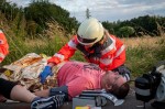 Das Motorrad fing Feuer und musste schnell gelöscht werden, um einen weiteren Schaden von den 'Verunfallten' abzuwenden. Nach einem ersten Überblick alarmierte der Gruppenführer zusätzliche Rettungsdienste und die Feuerwehr. Bei den "Verletzten" galt es, traumatische Verletzungen wie ein abgerissenes Bein, Verbrennungen, innere Blutungen und schwere Kopfverletzungen zu versorgen.