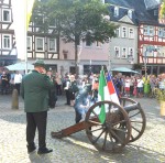 Pfarrvikar Frank-Peter Beuler von St. Peter in Ketten richtete sehr weltliche Worte an die Anwesenden, betonte die Bedeutung des Wortes Kirmes, das sich aus den Wörtern Kirche und Messe zusammensetzen würde. Er wünschte der Kirmes einen friedfertigen Verlauf. Anschließend wurde es zweimal sehr laut, zuerst schrie die Kirmesgesellschaft Montabaur aus voller Kehle den diesjährigen Kirmesspruch heraus, dann knallte es gewaltig, als die Schützengesellschaft St. Sebastianus mit sieben Böllerschützen ohrenbetäubend für den krachenden Abschluss der Eröffnung sorgte.