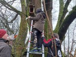Nistkastenkontrolle und -säuberung. Wer entdeckt als erster den Kasten im Baum, wagt sich auf die Leiter und was ist im Nistkasten zu finden? Die Kinder haben Spaß bei der Arbeit in der Natur und lernen so nebenbei Einiges über unsere heimische Vogelwelt. Im Herbst werden wieder Vogelhäuser gebaut und Winterfutter in Formen gegossen.