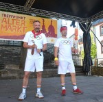 Am Alten Markt angekommen, suchten alle ein schattiges Plätzchen, um der stechenden Sonne etwas zu entfliehen. Der Musikverein Siershahn unterhielt die Besucher und die Kirmesgesellschaft mit flotter Musik, bis Stefan Leukel und Marco Pfeifer, unter dem Beifall der Besucher, gemeinsam zur Bühne liefen und ihre gestählten Körper stolz zur Schau stellten. Nach einer kurzen Begrüßung gesellte sich Kirmesekel Lukas Schäfer zu ihnen, wobei zahlreiche Zuschauer auf ein Handgemenge gehofft hatten. Doch Bürgermeister Leukel rückte, ohne viel Widerstand zu leisten, den Stadtschlüssel heraus, den Kirmesekel Schäfer freudig entgegennahm, übt er doch damit am Kirmesmontag die Macht in der Stadt aus.