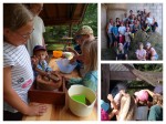 Die Erkundung und das Aufstauen des kleinen Baches hinter der Grillhütte machten den Kindern ebenso viel Spaß wie der Laubhüttenbau und so wurden auch die heißen Tage gut erträglich. Ohne nasse Füße kam fast niemand durch die Woche! Am Donnerstag wurde über einen ganzen Vormittag der Bio-Bauernhof der Familie Aller in Vielbach erkundet: Viele Tiere und Tierarten wie Kühe, Schweine, Pferde, Katzen, Enten bis hin zu Schwalben gab es zu sehen und manche davon auch zum Anfassen. Butter wurde direkt dort selbst geschüttelt und direkt mit Honig auf dem Brot gegessen. Lecker!