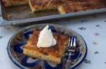 Der Blechkuchen lässt sich verfeinern, wenn man ihn, sobald er aus dem Ofen kommt, mit etwas Aprikosenkonfitüre bestreicht. Man kann auch noch Mandelblättchen darüberstreuen.