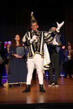 Bürgermeister Michael Merz führte anschließend die neuen Regenten in ihre Ämter ein. Nachdem Jenny I. als "Regentin des närrischen Treibens" ernannt wurde, folgte die Inthronisierung von Christoph III., dem blau-goldenen Reiter. Dieser Titel geht auf Christoph Vohs zurück, der seit 2009 Mitglied im Verein ist und bereits zahlreiche Positionen (darunter Gardist und Beisitzer im Vorstand, Mitglied im Elferrat und Tänzer im Männerballett) innehatte.
