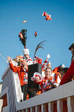 Nach diesen erfolgreichen Veranstaltungen war die Vorfreude auf den Höhepunkt der Session – den Rosenmontagszug – besonders groß. Und die Erwartungen wurden nicht enttäuscht: Pünktlich um 14.11 Uhr setzte sich der farbenfrohe Zug in Bewegung. Die prächtig geschmückten Prunkwagen, detailverliebt mit unzähligen Papierrosen dekoriert, rollten durch die Straßen und begeisterten die Zuschauer. Begleitet wurden sie von zahlreichen Fußgruppen, die in kreativen Kostümen durch die Menge tanzten und die gute Laune weiter anheizten.