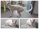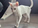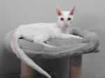 Ransbach-Baumbach. Ozcar, ein Kater wie kein anderer - innen wie außen. Geboren am 1. Juni 2020, fasziniert dieser Cornish Rex mit schneeweißem, seidig gelocktem Fell und zwei unterschiedlich farbigen Augen - eines in klarem Blau, das andere in zartem Grün. Ozcar ist ein echter Blickfang. Diese Rasse ist bekannt für ihren schlanken, muskulösen Körperbau mit langem, dünnem Schwanz, auffallenden, ovalen Augen und den charakteristischen, großen Fledermausohren, die bei Ozcar besonders gut zur Geltung kommen.