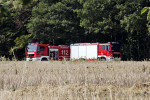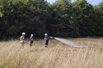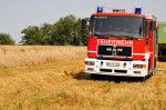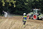 Die eingesetzten Trupps konnten den Brand des landwirtschaftlichen Gerätes zügig unter Kontrolle bringen und dann ablöschen. Es war nicht zu verhindern, dass eine kleine Fläche, rund 150 Quadratmeter, ebenfalls in Brand gerieten. Diese konnte sehr schnell abgelöscht werden. Die Einsatzkräfte bewässerten vorsorglich angrenzende Flächen, um einer Rückzündung vorzubeugen. Für die Einsatzkräfte war dieser Einsatz, aufgrund der hohen Temperaturen, recht kräftezehrend. Die Feuerwehren waren mit mehreren Fahrzeugen, die über große Mengen Wasser verfügen, vor Ort. Eine Wasserversorgung wäre sonst nur mit großem Aufwand möglich gewesen.