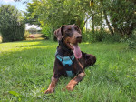 Amor, 37 kg schwer, trägt den charakteristischen Jagdinstinkt eines Dobermanns in sich. Es besteht eine Leinen- und Maulkorbpflicht. Beides kennt er bereits und lässt sich damit zuverlässig führen.