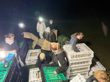 Schwache oder erkrankte Tiere werden in Einzelboxen gesetzt und bei Bedarf vor Ort erstversorgt. Andere Helfer tragen die Boxen zu den Fahrzeugen, mit denen die Hennen anschließend zu Pflege- oder Endplätzen gebracht werden.