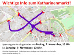 Da der Katharinenmarkt traditionell viele Gäste anzieht, weist die Stadt Hachenburg auf einige Verkehrsregelungen hin. Das Marktgelände wird bereits ab Freitag, 7. November, 10 Uhr, bis Sonntag, 9. November, 12 Uhr, vollständig für den Fahrzeugverkehr gesperrt. Eine Umleitung ist ausgeschildert. Auch der Lieferverkehr ist in dieser Zeit nicht möglich.