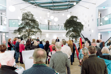 Die Vernissage fand im Atrium des Hauses Coblenz statt. Boris Nannt, Vorstandsvorsitzender der Akademie Deutscher Genossenschaften (ADG), begrüßte die Gäste und lobte die künstlerische Auseinandersetzung mit dem genossenschaftlichen Gedanken. "Mit dieser Ausstellung wird Kooperation auf besondere Weise über Kunst sichtbar. Passend zum Internationalen Jahr der Genossenschaften zeigt sie, wie aktuell der Genossenschaftsgedanke ist. Künstler mit ganz unterschiedlichen Sichtweisen sind per Losverfahren zusammengekommen - und haben gemeinsam etwas Neues geschaffen." Nannt dankte den beteiligten Künstlern sowie den beiden Kunstvereinen für ihr Engagement und hob die Bedeutung des Schlosses Montabaur als Ort des Austauschs hervor.