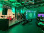 Ein episches Intro auf der raumeinnehmenden Leinwandkonstruktion rief kurz nach 18 Uhr die Gäste zur Eröffnung des Gala-Abends. Bis dahin hatten die Anwesenden noch großteils verstreut das Entertainment in der Denkfabrik wahrgenommen. Besonders die Fotobox mit den diversen Verkleidungsoptionen in der Ecke links neben der Bühne hatte es ihnen angetan. Aber auch der stilistisch treffsichere Getränkewagen des Eventservices "Die Idee" durfte sich über regen Andrang freuen. Nun aber wurde sich an den weihnachtlich dekorierten Tischen eingefunden, ehe das Moderations-Duo, bestehend aus Nicole Schneider und Björn Flick, die Veranstaltung offiziell einläutete. Locker und mit viel Humor gelang es beiden gleichsam, auch die eher trockenen Themenblöcke recht kurzweilig an den Mann zu bringen.