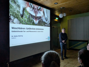 Mehr als 60 Zuhörer füllten das Foyer der Ollmersch-Halle, um den Vortrag von Dr. Stefan Nehring zu verfolgen. Der Biologe referierte über die Auswirkungen gebietsfremder Arten wie dem Waschbären und regte eine lebhafte Diskussion an.
