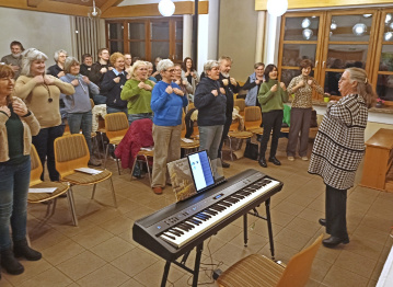 Ferner konnten Volkslieder gewünscht werden. "Singen ist gesund", betonte Edda Sevenich und ermutigte die Anwesenden, ihre Stimme nicht nur im Auto erklingen zu lassen, wo es vielleicht niemand hört, sondern immer dann, wenn ihnen danach ist. Denn Singen, so Sevenich, tue der Seele gut und schenke neue Kraft. Mit dem geistlichen Abendlied "Der Mond ist aufgegangen" fand der Abend einen besinnlichen Abschluss. Die Teilnehmenden dankten Edda Sevenich mit lang anhaltendem Applaus für das gemeinsame Singen.