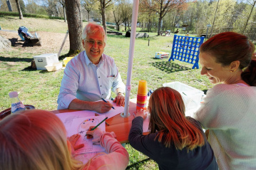 Heute kommt er ohne Bauwagen aus, dafür mit Klappbänken, Sonnenschirmen, Getränken und kleinen Snacks. Auf den Spielplätzen entstehen so Orte, an denen Familien zwischen Rutsche und Schaukel eine Pause einlegen können. Für Kinder stehen Spiele, Malangebote und eine große Vier-Gewinnt-Tafel bereit.