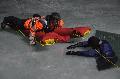 Gleich mehrere Möglichkeiten gab es dann für die Einsatzkräfte der Feuerwehr, einen Menschen aus dieser misslichen Lage zu retten. Zuerst wurde mit einer Leiter geprobt. Auf dieser Leiter liegend robbte sich der Feuerwehrmann bis zum Einsturzloch, um den zu Rettenden ans sichere Ufer zu bringen. Weiter wurden ein Schlauchboot genutzt und letztendlich auch eine auf dem Bauch auf der Eisdecke liegende Menschenkette. Auch hier wurde immer wieder auf das Anleinen hingewiesen.