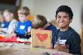 Der Kinderkirchentag gibt Einblicke in Luthers Wirken. Natürlich nicht mit staubtrockenen Vorträgen, sondern pfiffigen Workshops. Einer widmet sich natürlich dem legendären Thesenanschlag des Jahres 1517, den die Kinder 500 Jahre später nachstellen. In Roßbach bringen sie ihre eigenen Thesen zu Papier und nageln die Zettel an eine alte Holztür. Die Sätze, die dort stehen, sind zeitlos: „Gottes Liebe ist nicht käuflich, sondern ein Geschenk“ hätte sicher auch Luther aus dem Herzen gesprochen. Ein Herz basteln die jungen Gäste anschließend übrigens auch noch und verzieren es mit bunten Schnüren – oder mit Metalldraht. So wie Jakob, der mit seinem glänzenden Herzbrettchen insgeheim noch etwas vorhat: „Das würde ich gerne mal unter Strom setzen“, sagt er grinsend.