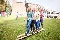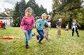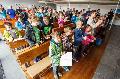 Nach so viel Kreativität und Handarbeit gibt’s für die Jungs und Mädchen am Mittag herzhafte Pizza. Danach haben sie ausgiebig Zeit, sich auf dem großen Spieleparcours auszutoben, bevor der Abschlussgottesdienst in der Roßbacher Kirche beginnt. In ihm stellen die Kinder all das vor, was sie in den Workshops gebastelt, eingeübt und gelernt haben: Mit den selbstgebastelten Instrumenten begleiten sie die Lieder; erklären, warum es Gottes Liebe gratis gibt; zeigen ihre Drucke und den kargen Rest der selbstgebackenen Plätzchen. Und sie erzählen, dass Luther vor lauter Freude über Gottes Liebe die Treppe heruntergehüpft ist.