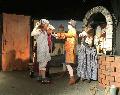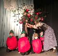 Die Zuschauer erleben gespannt, wie die wüsten Beschimpfungen der Stiefmutter und der bösen Stiefschwester, in Szene gesetzt durch Marie Kunz, außer Kontrolle geraten. Als die Spindel, mit der Goldmarie Wolle spinnen soll, auch noch in den Brunnen fällt und sie von Angst getrieben hinterher springt, halten insbesondere die jüngeren Zuschauer gebannt den Atem an. Als Goldmarie auf einer Wiese in einem ihr unbekannten Land erwacht, warten dort zwei schwierige Aufgaben auf sie. Ein Backofen und ein Apfelbaum erwachen durch Ute Thoma (Ofen) und Lena Zimmermann (Apfelbaum) zum Leben. Die süßen roten Äpfel und die knusprigen Brote werden traumhaft gespielt von den Schauspielern des Kinder- und Jugendtheaters: Amy Bösing, Joschua Collée, Emily Fritz, Jolina Hof, Lenja Groß, Lene Jacob, Leni Rochholl, Emily Wenzel, Lara Windt, Katharina Wisser, Marie Salziger, Mia-Luise Woiner und Nora Zorn. Für die entsprechende liebevolle Choreografie dieser beiden Prüfungen verantwortlich zeichnen Saskia Wolf, Hanna Aßmann und Franziska Wurster.