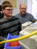 Damit beide Seiten profitieren, lässt Mathias Bohn sich einiges einfallen. Für Marius Neeb, der nicht im Stehen und an komplexen Anlagen arbeiten kann, reaktivierte er eine kleine CNC-Maschine und ließ einen passenden Tisch fertigen. Die Agentur für Arbeit Montabaur schickte ihren technischen Berater in den Oberwesterwald und bezahlte die Konstruktion. Der Arbeitsplatz des Rollifahrers ist direkt mit dem PC des Kollegen verbunden, der die EDV-technische Vorbereitung macht. Denn Marius Neeb graviert viele unterschiedliche Werkstücke – angefangen von Schlüsselanhängern über Garderobenmarken bis hin zu den Metallplaketten, die die Schläuche, Kabel und Versorgungsleitungen großer Produktionsanlagen kennzeichnen.