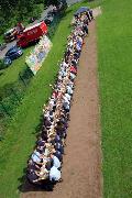 „Einfach zu Tun“ klingt leichter als gesagt, denn das Event ist inzwischen eine logistische und organisatorische Herausforderung. 2200 Menschen mit fast 3300 Brötchen innerhalb einer Dreiviertelstunde zu versorgen und anschließend von allen Gruppen noch ein schönes Frühstücksfoto zu machen, ist gar nicht so einfach und nur Dank der tatkräftigen Unterstützung von einem gut organisierten Team möglich. Die Veranstaltung, die gemeinsam von Quartiersmanagement Höhr und dem Jugend- und Kulturzentrum „Zweite Heimat“ durchgeführt wird, erhält nicht nur ehrenamtliche Unterstützung, sondern auch prominente Hilfe. So lässt es sich Bürgermeister Thilo Becker zum wiederholten Male nicht nehmen, die Brötchen mitzuverteilen und sogar die Fotos auf seiner Route zu „schießen“. Besonders freut er sich in diesem Jahr darüber, dass er die Siegergruppe am Moorsberg mit dem vom Rewe gesponsorten „Fresskorb“ beglückwünschen kann. Denn dort frühstückt die Freiwillige Feuerwer im Rahmen des 50-jährigen Jubiläums der Jugendfeuerwehr und die große Tafel bringt es hier auf stattliche 31 Meter mit 130 Menschen - die größte Gruppe an diesem Sonntag.